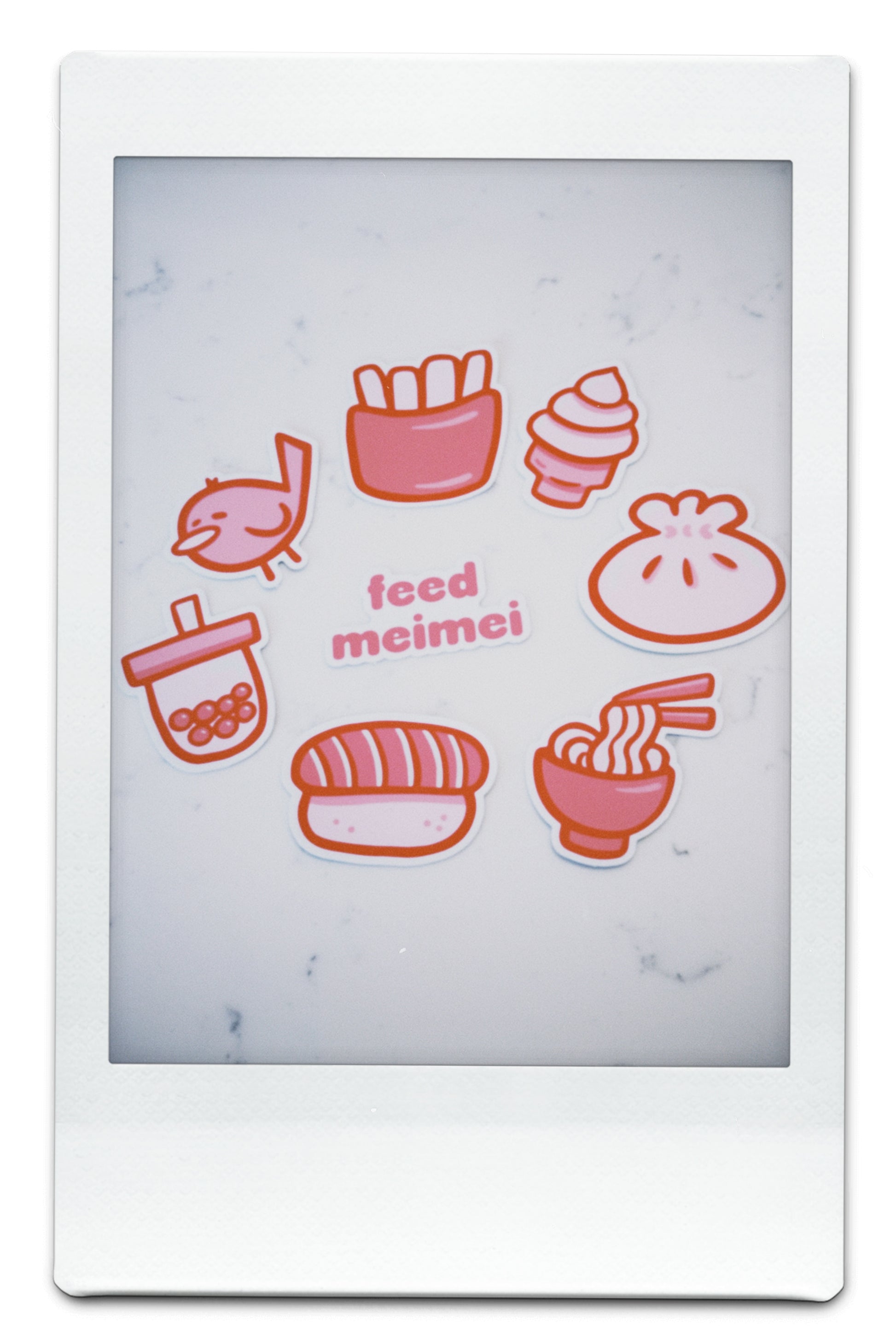 Shop this sticker set, featuring meimei’s favorite foods like boba, noodles, dumplings, sushi, fries and ice cream!